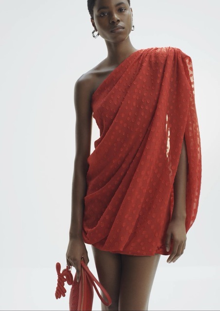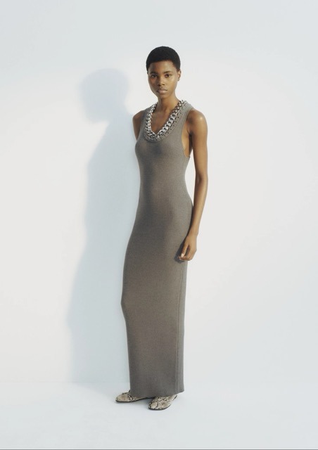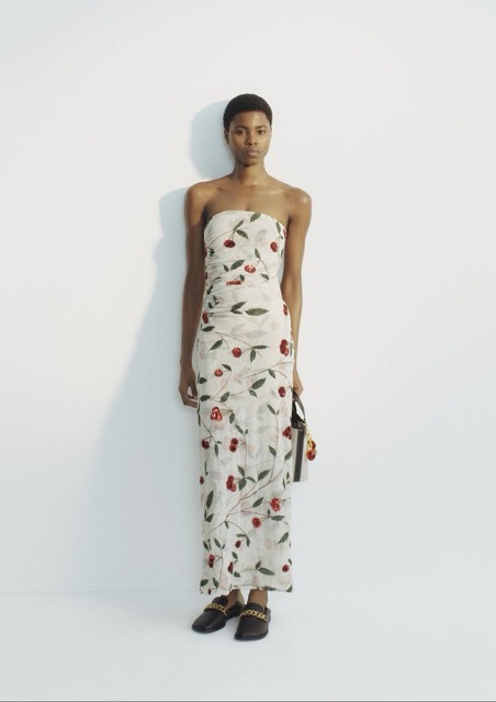 Claro que também há peças statement. Por exemplo, o vestido branco comprido com manga-capa reforça o lado mais dramático e escultórico da linha, a par de tops e vestidos de rede com padrão de cereja ou uma reinterpretação da mítica T-shirt Rock Royalty com tachas (olá, Met Gala de 1999), que também cumprem a missão de conferir uma energia mais irreverente à linha. Nos acessórios, há malas em diferentes escalas, um modelo em tom chocolate com corrente, mocassins com detalhes metálicos e joalharia produzida a partir de metal reciclado.