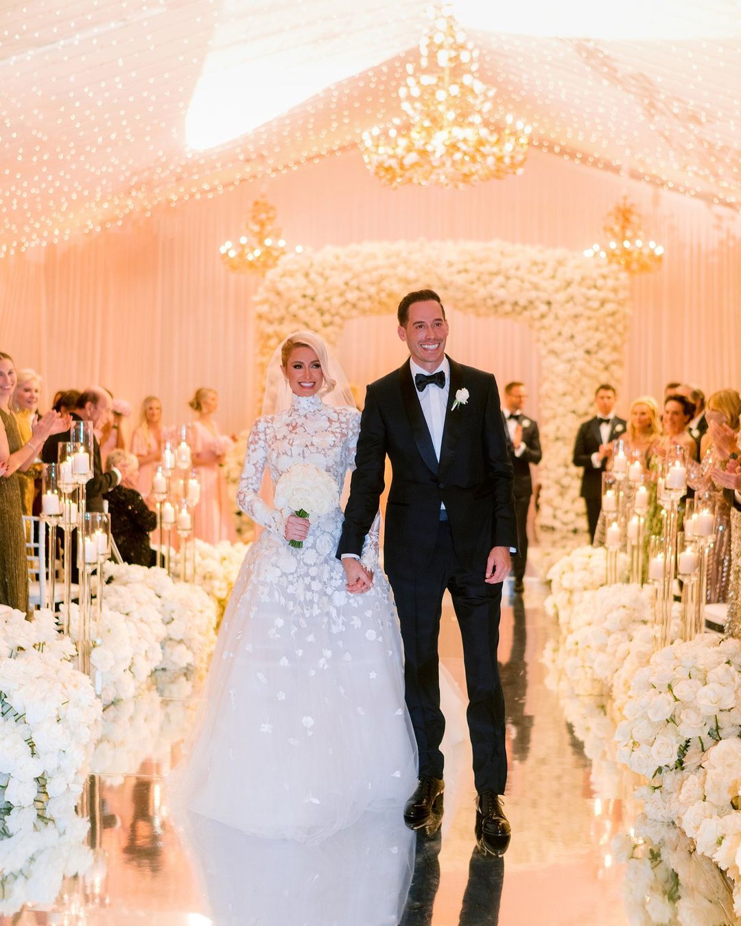 Paris Hilton e o empresário americano Carter Reum organizaram uma festa de três dias. Depois de trocarem alianças, a celebração continuou no parque de diversões Santa Monica Pier, na Califórnia. Desde jogos com a cara de Paris ao enorme bolo de vários andares com o casal representado num Ken e numa Barbie, tudo contribuiu para que a festa fosse memorável. Nesse dia em particular, o look cor de rosa da socialite não passou despercebido: um véu, top rendado e com lantejoulas, saia em folhos e botas de cano alto.