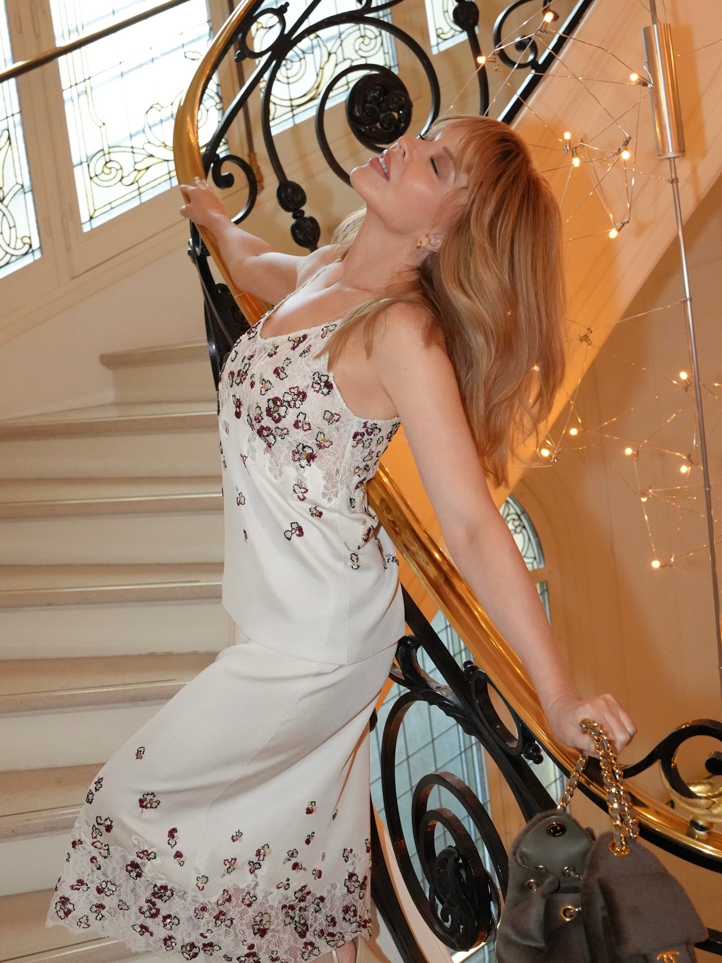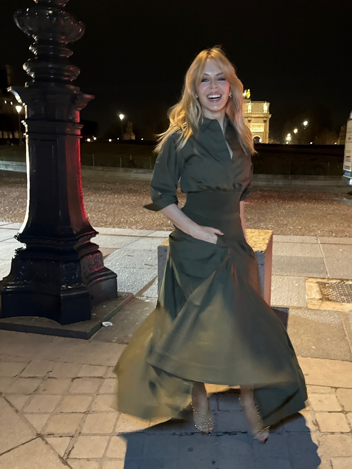 A cantora australiana Kylie Minogue voltou a dar que falar depois de partilhar novas imagens nas redes sociais. Nas fotografias, surge descontraída numa escadaria em tons dourados e brancos, com um vestido curto, branco e ousado, marcado por recortes laterais, aberturas na coxa e detalhes em franjas prateadas. O visual foi completado com sapatos de salto alto em cetim branco, de biqueira fechada.