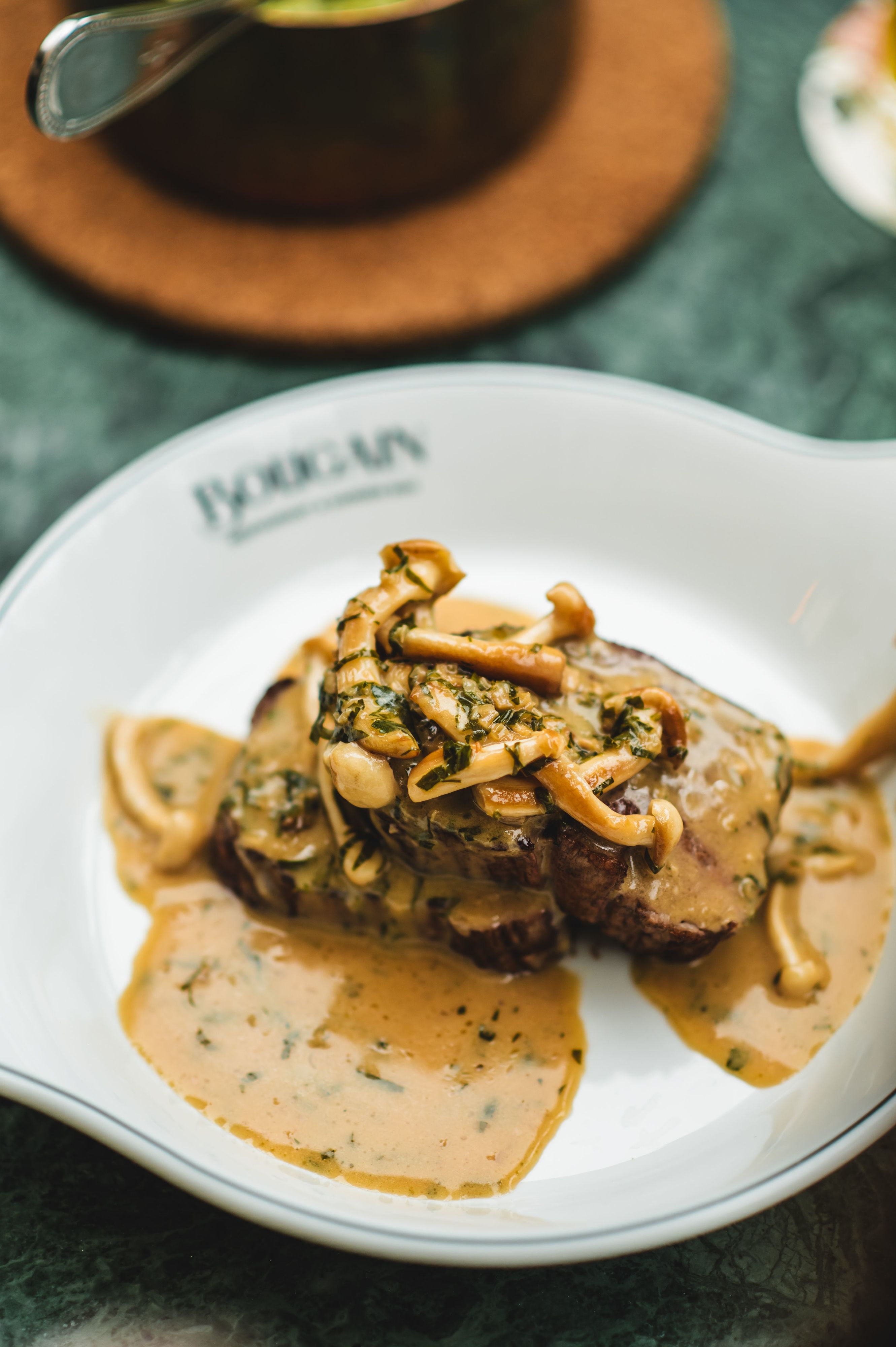 O couvert (flatbread, pão de azeitona, pão de Mafra, manteiga de alho e ervas) tem um custo de 1€ por pessoa. Como entradas, há sopa de melão e pepino (15€), salada de burrata (16€) e camarões al ajilo (17€). No menu principal, há diferentes pratos que vão satisfazer os amantes de carne. Entre eles, há entrecôte (28€), pato confitado (28€), costeletas de borrego (32€), steak tartare (29€) e steak diane (30€).