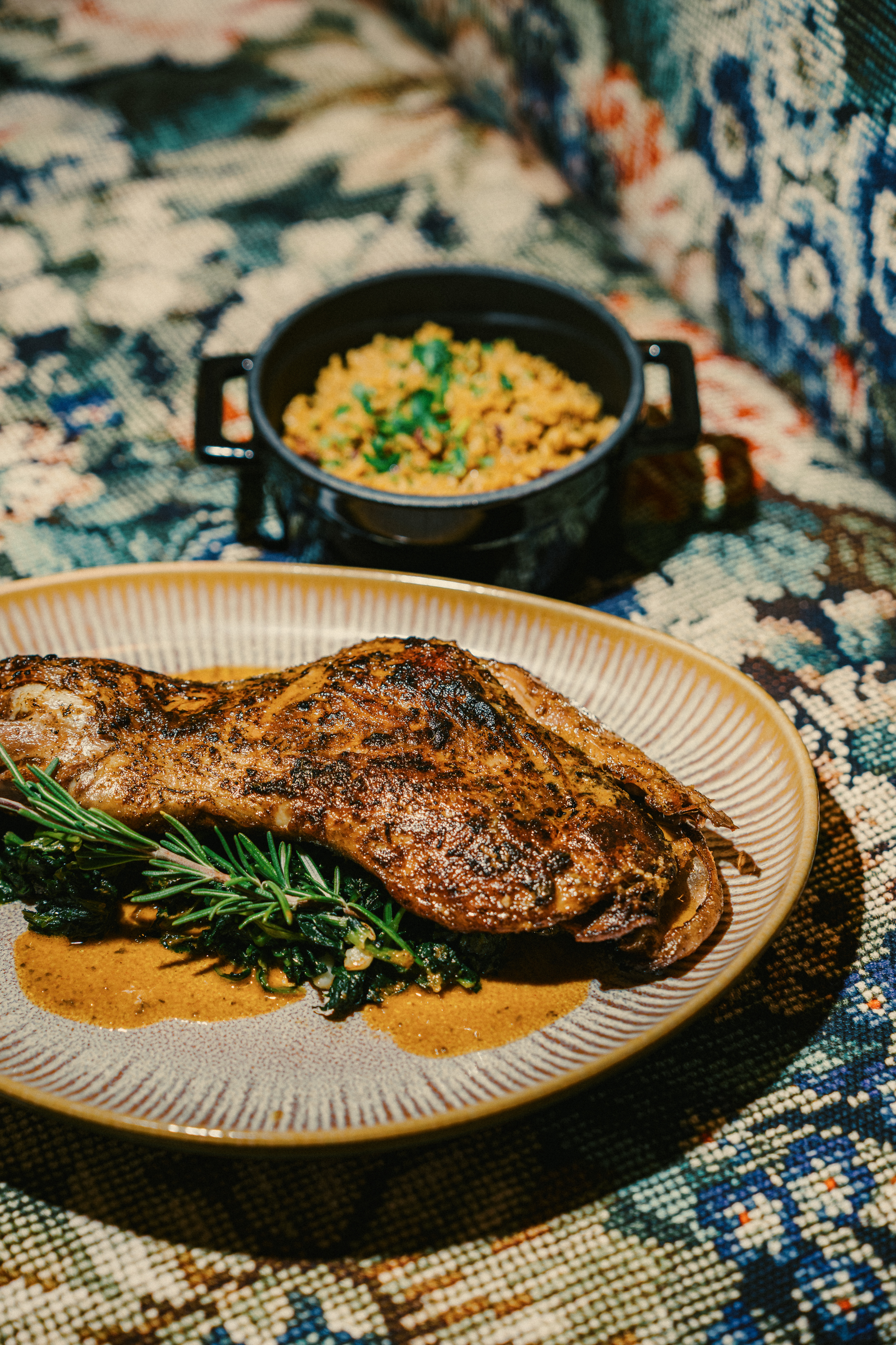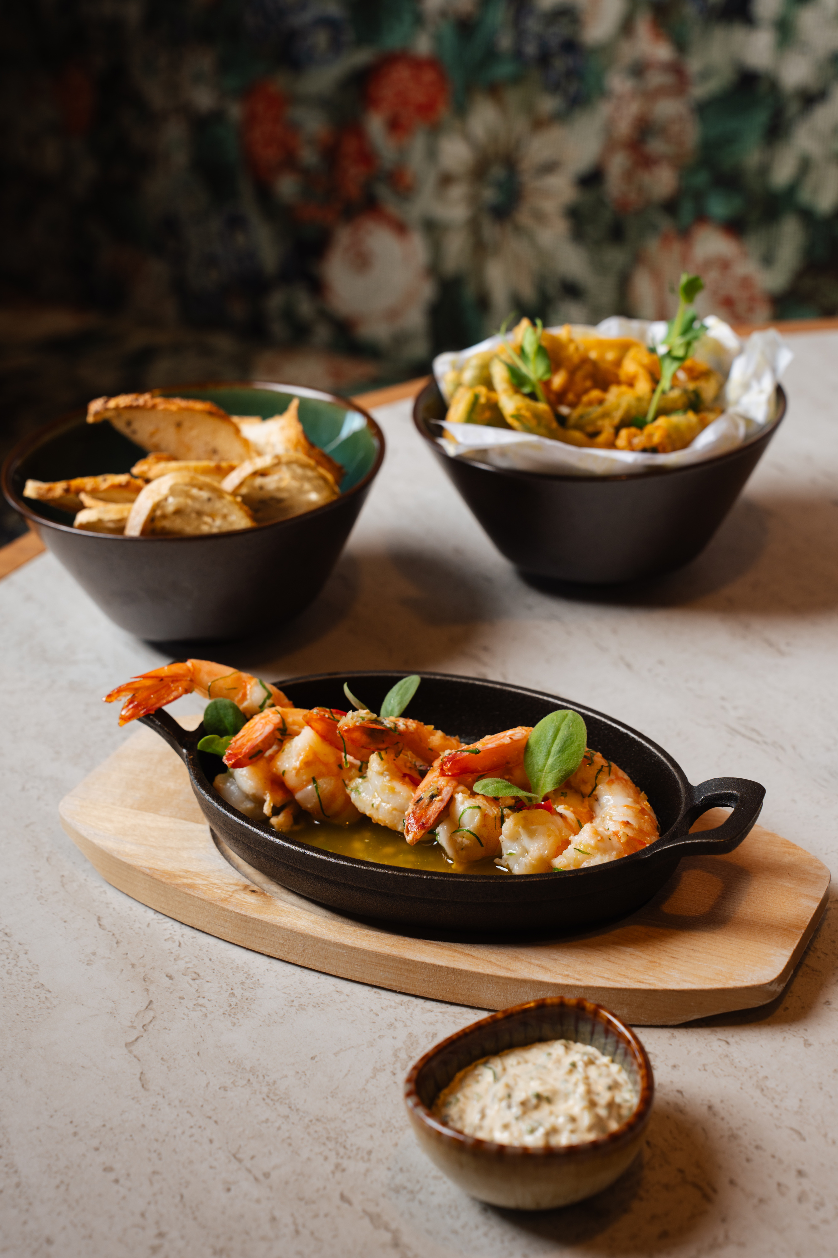 Nas entradas, o protagonismo vai para o ovo dourado, cozinhado a baixa temperatura, servido com alheira de Mirandela, cogumelos repolgas, originais de Trás-os-Montes, salteados, couve portuguesa glaceada num caldo de legumes e manteiga e massa kataifi (11€). Há ainda outras opções deliciosas, como as pataniscas de camarão e pimentos com maionese de salsa (13€), bolinhos de bacalhau com beurre blanc e coentros (11€) ou as gambas selvagens ao alho, com coentros frescos e tostas de azeite e tomilho (14€).