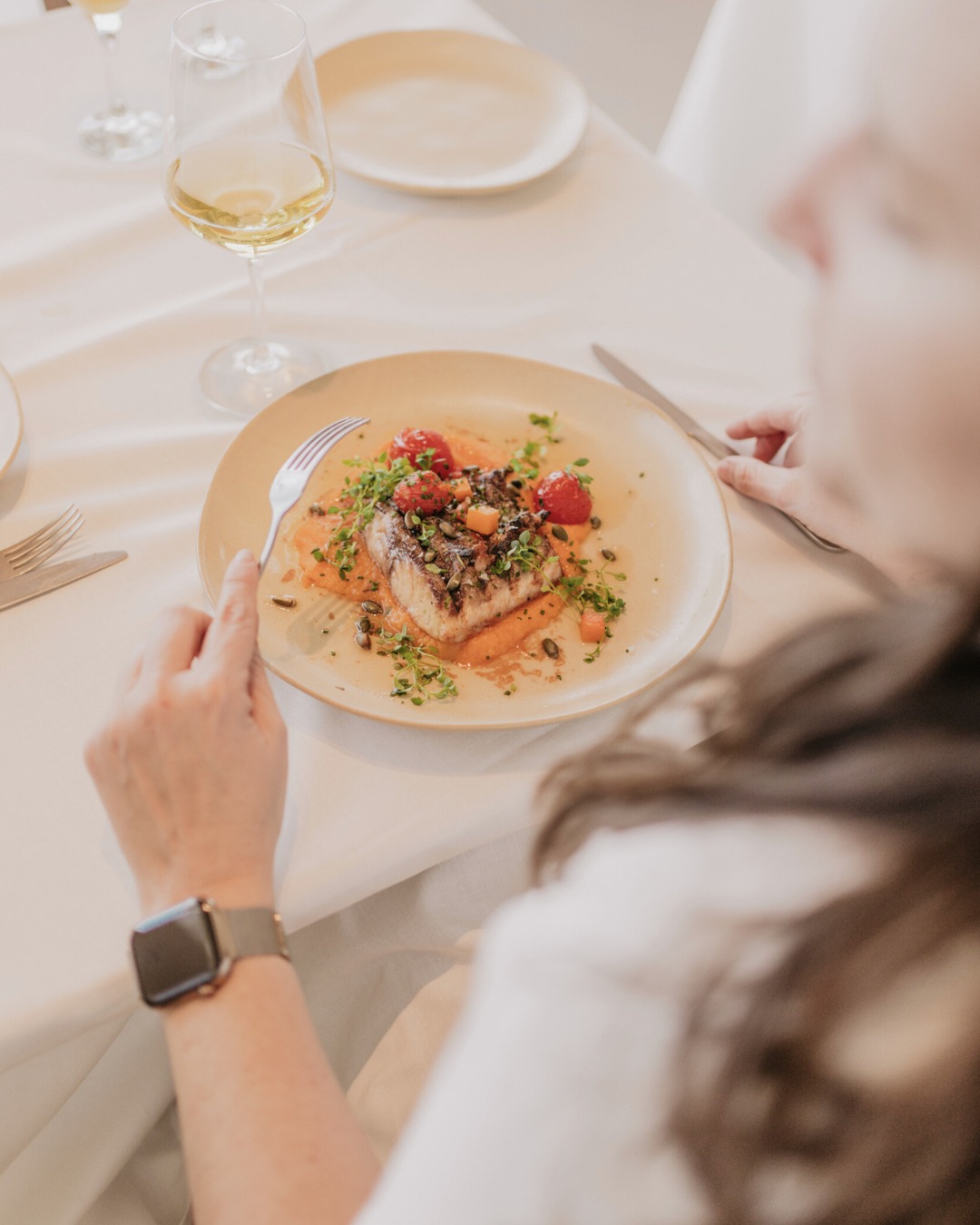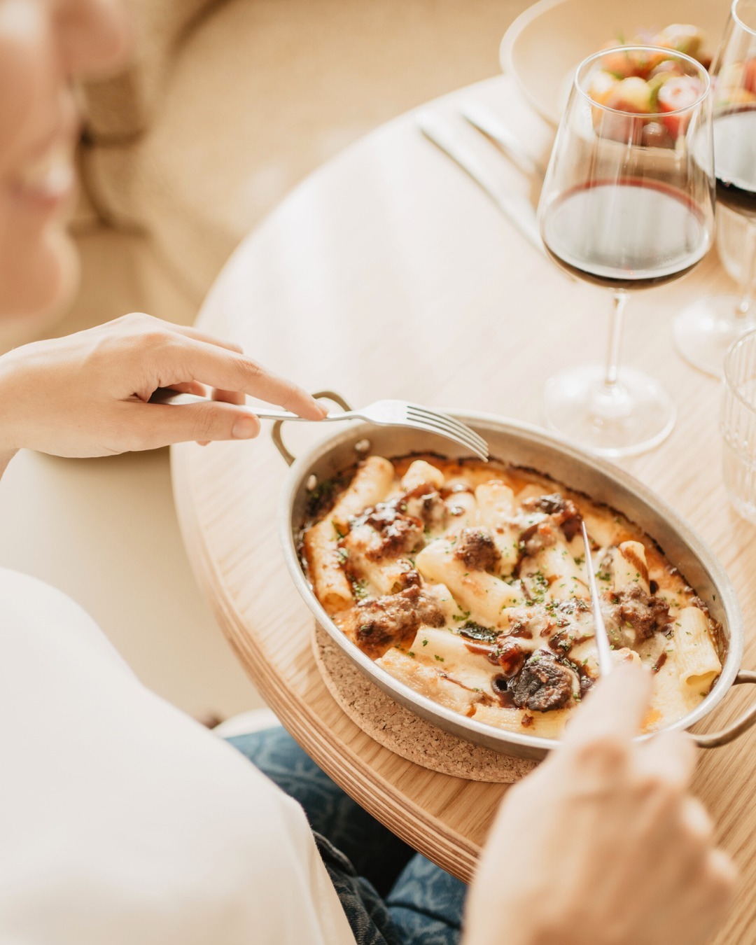 Como pratos principais de carne, pode optar pelo macarrão à Barceloneta com vaca maturada e secreto ibérico (21,60 €), pelos canelones de carne assada com bechamel suave (19,30€), pelo entrecôte Holstein maturado com “Pont Neuf” e manteiga (32,70 €) ou pelo bife Wellington com duxelle de cogumelos, foie e demi-glace (34,50€).