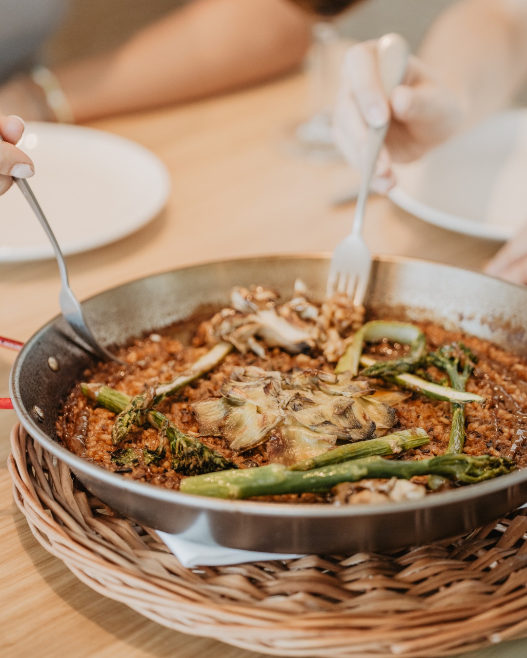 Vindos do mar, tem lombo de bacalhau com tâmaras, frutos secos e parmentier trufado (25,60€), robalo grelhado com molho de ervas cítricas, espargos, bimi e alcaparras (32,40€), massa negra recheada com tamboril, pescada e marisco com molho crustáceo (22,90€) ou calamar recheado com courgette e redução própria (26,80€).Os arrozes são as estrelas do El Tribut (e devem ser consumidos por, no mínimo, duas pessoas): desde o arroz vegetal com alcachofras, espargos, broccolini e cogumelos (24,80€) ao arroz de camarão vermelho, mexilhões e calamar com fumet de marisco (26,70€) e ao arroz caldoso com lagosta, peixe e mexilhões (38,50€).