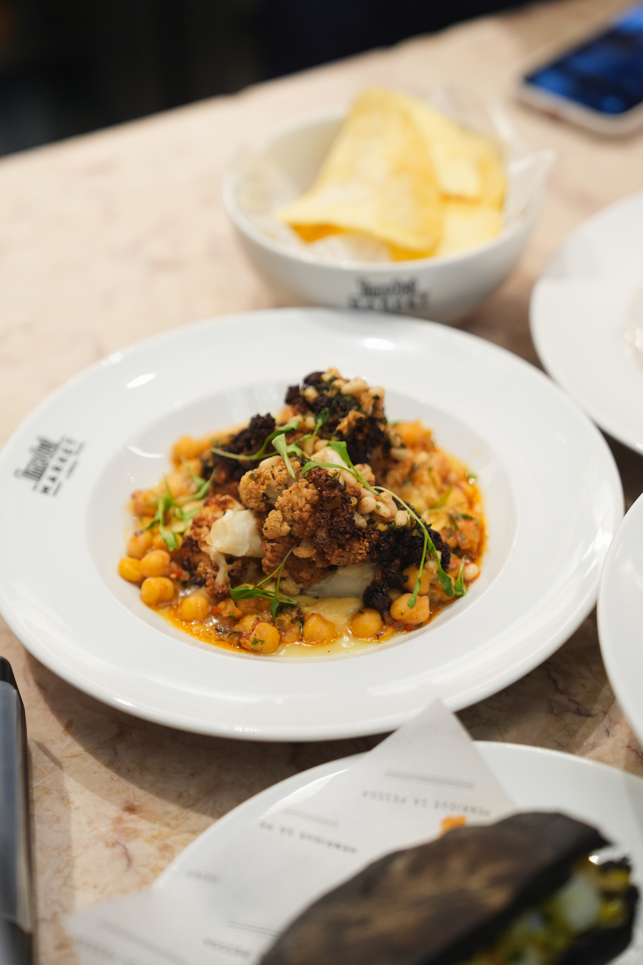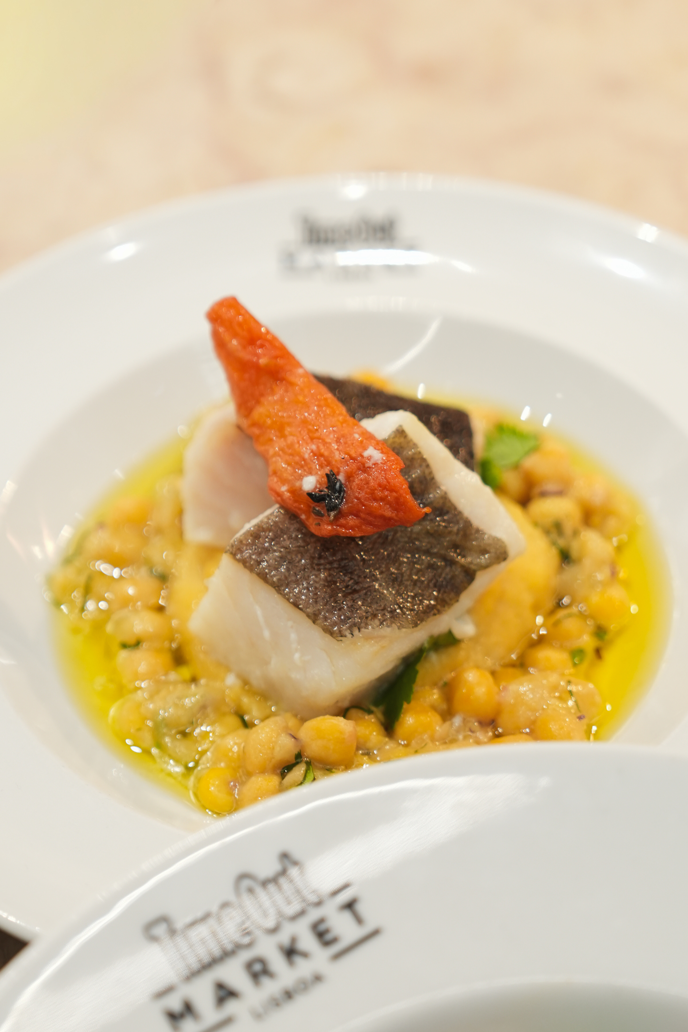 Provámos ainda um clássico da gastronomia portuguesa, bacalhau confitado com grão de bico e tomate seco (15,90€), uma proposta que acompanha o chef desde 2006. Seguiu-se uma opção vegetariana cheia de sabor, a couve-flor assada com hummus, vinagrete de grão, picadinho de pinhão tostado com alho e chilli, com um sabor suave a malagueta por cima (13,50€).