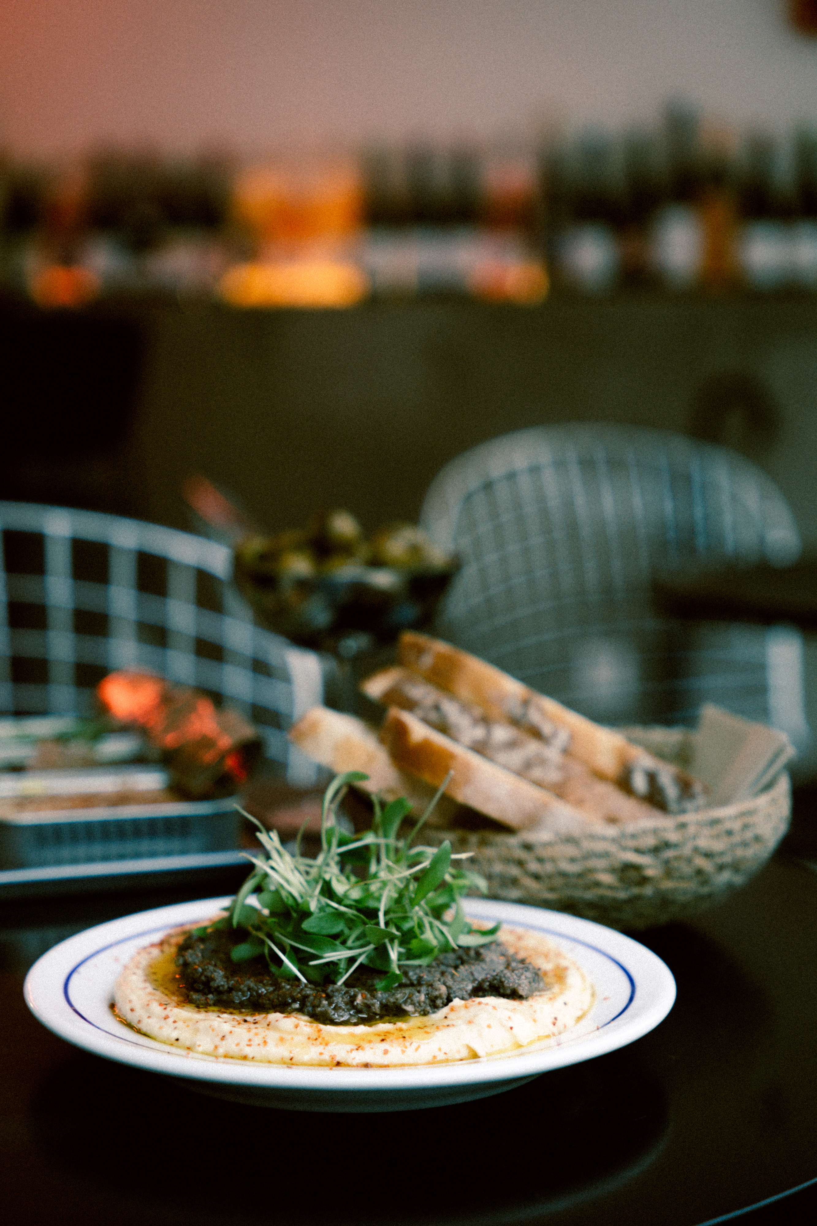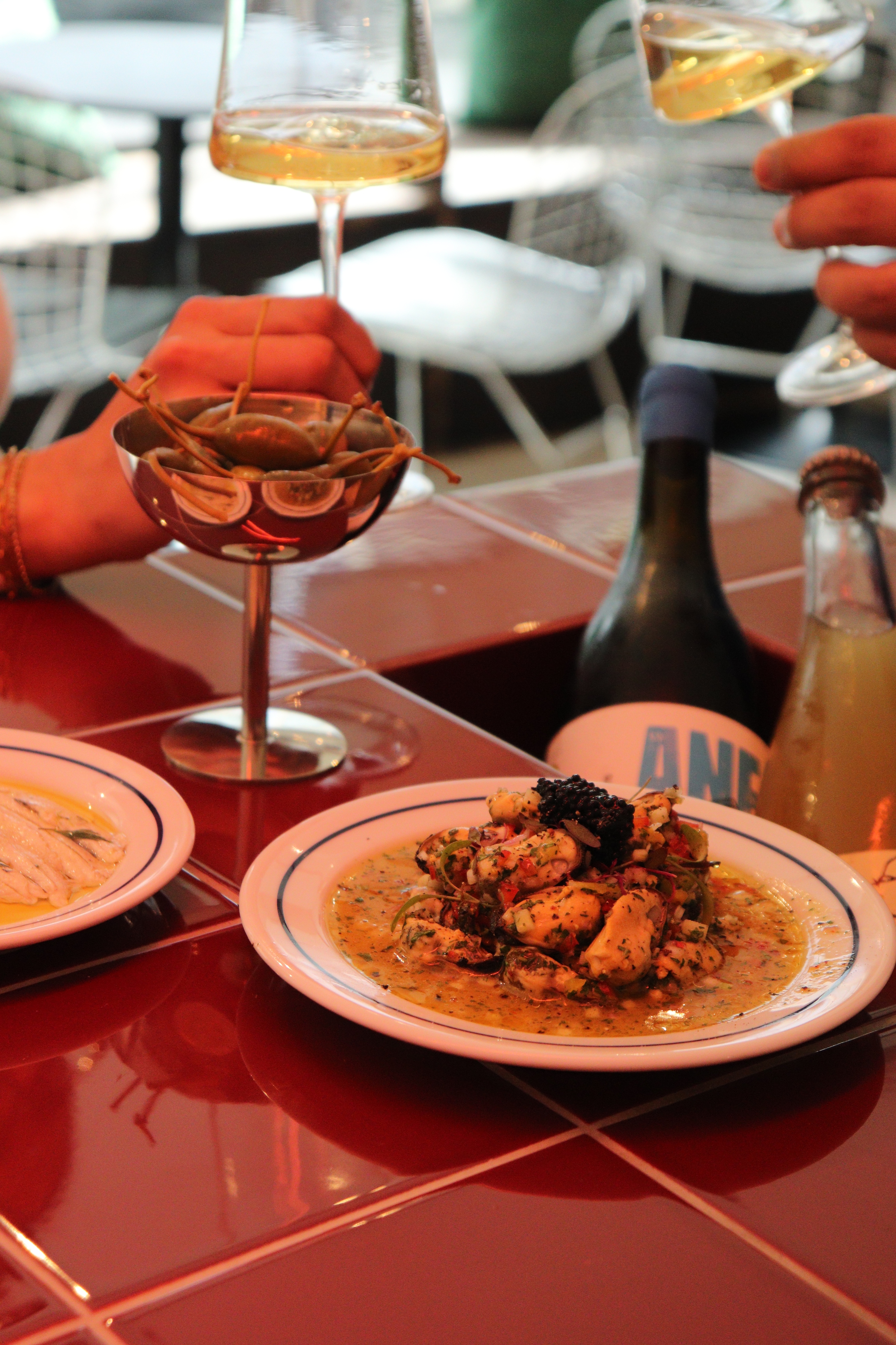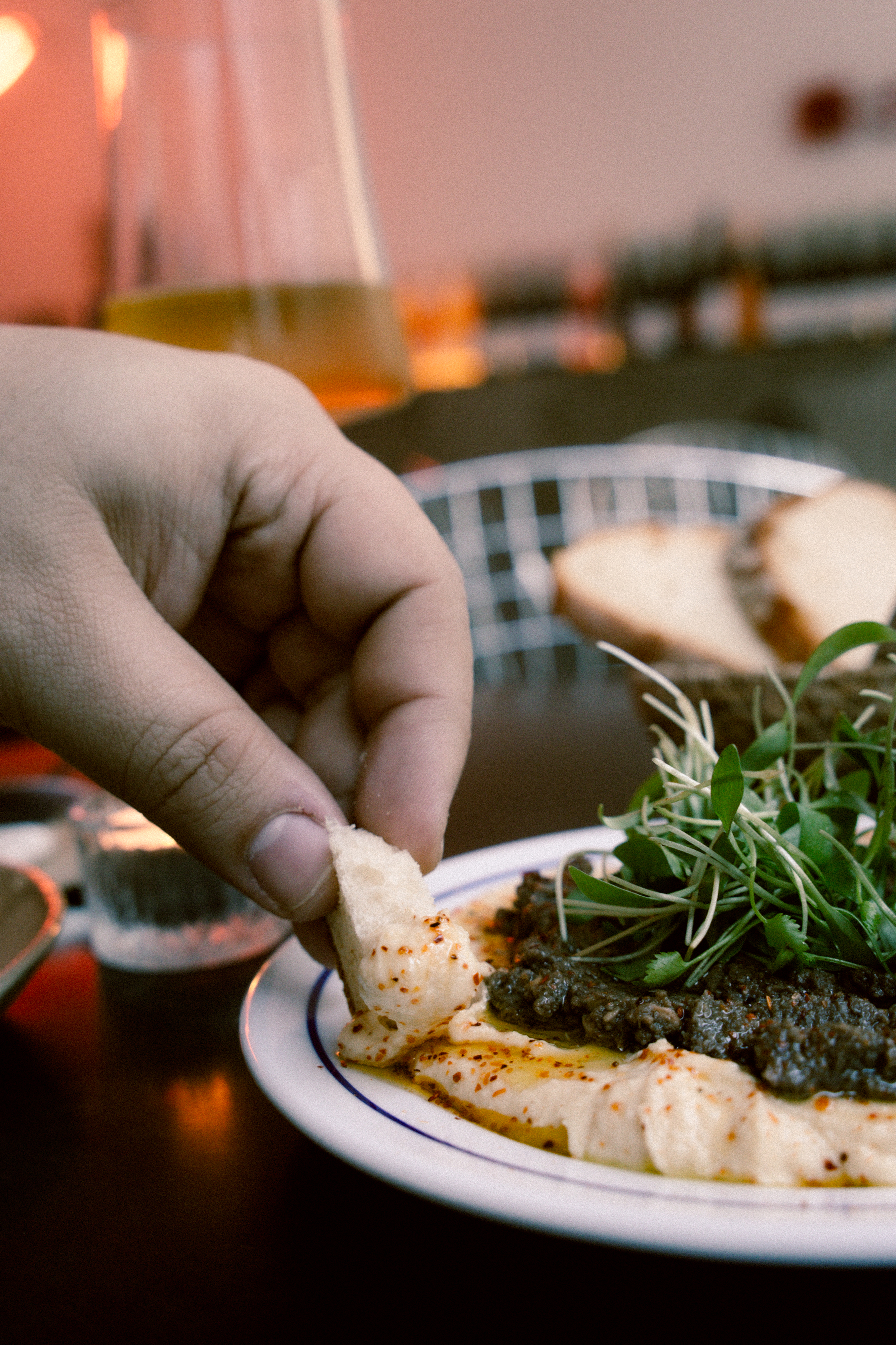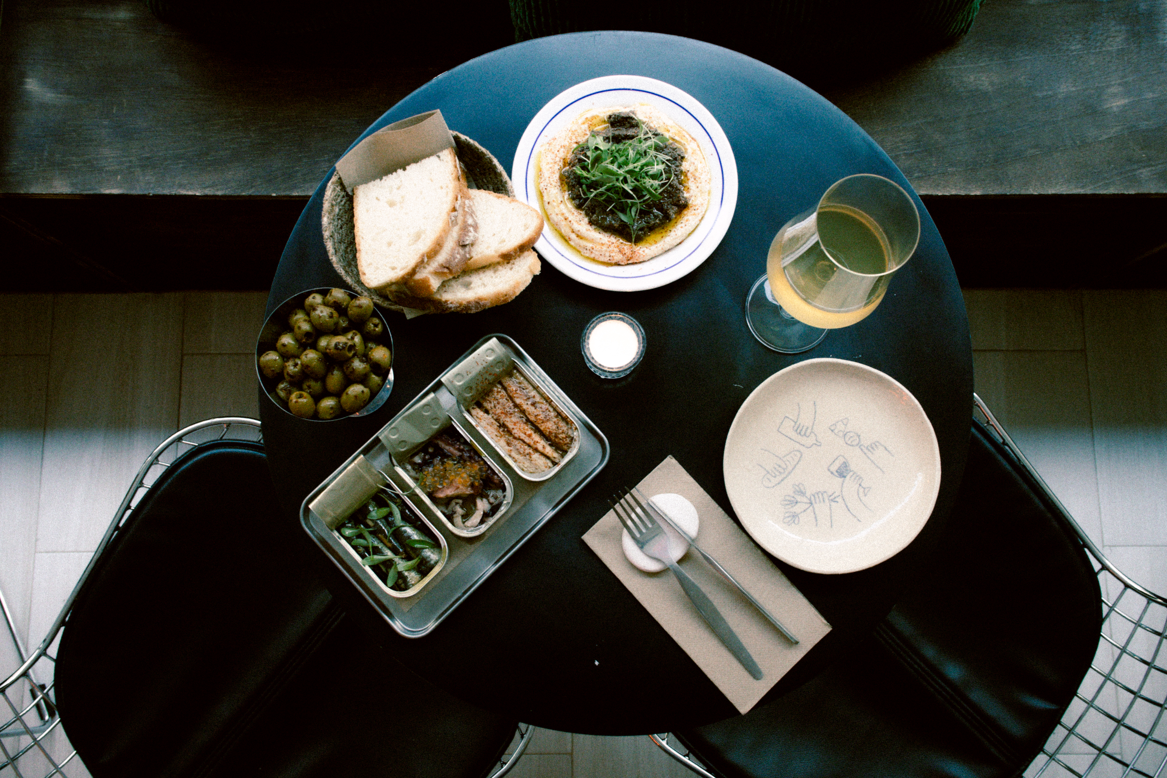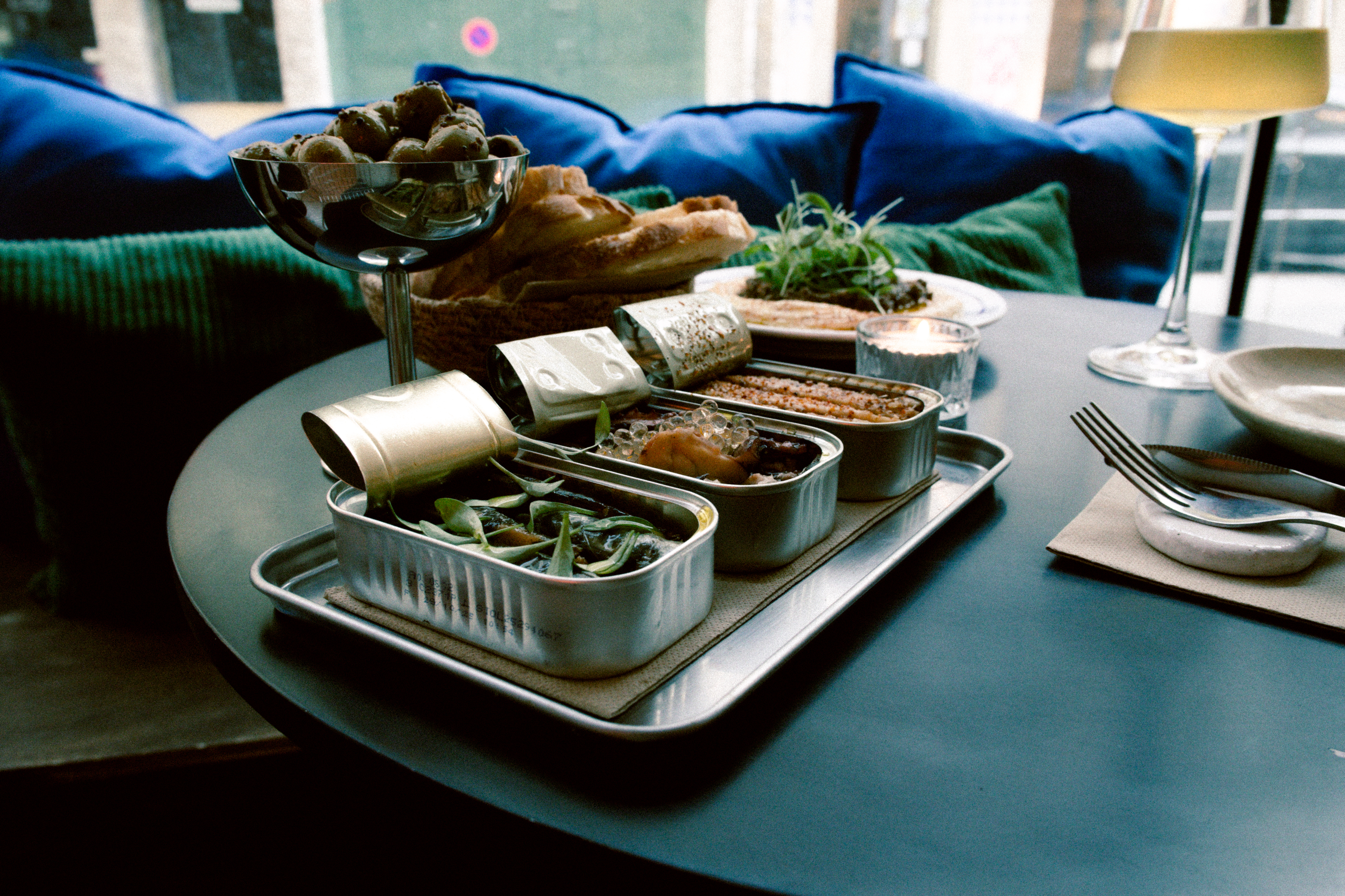 Se prefere algo mais composto para saciar a fome, pode comer rillete de pato com pão e pickles de pepino (8€), húmus de tahine e cogumelos (9€), sopa de tomate com queijo quente (10€), gildas (4 unidades por 9€) ou Smørrebrød, um prato dinamarquês com uma base de brioche, tapenade de azeitona preta e brandade de bacalhau (10€).