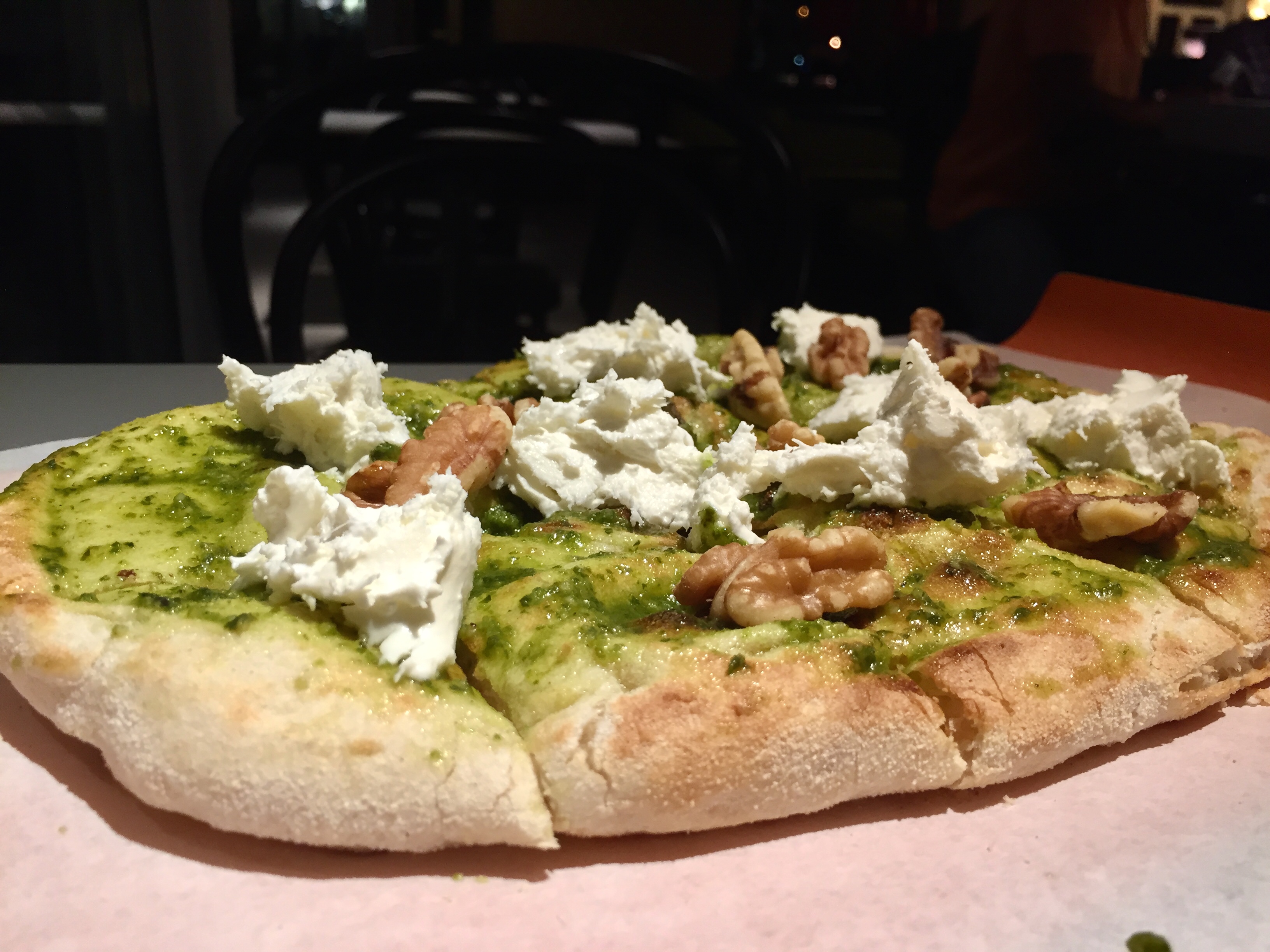 O que se seguiu só ajudou a relaxar ainda mais: uma pinsa. Sim, pinsa e não pizza, porque a do Bixos é feita com “ingredientes naturais e vegetais, tem 50% menos energia, açúcar e carboidratos, 80% menos gordura e 100% menos colesterol”, explica o restaurante. Tudo isto vai a altas temperaturas num forno de lenha e o resultado é surpreendentemente saboroso. Optámos pela pinsa de pesto, nozes e burrata (9€ a mais pequena), mas para os fãs de carne é famosa a de abóbora, guanciale (tipo de bacon não defumado italiano) e gorgonzola (desde 9,5€) e há outra mais irreverente de anchova, alcaparras, tomate e ricotta (desde 9,5€).