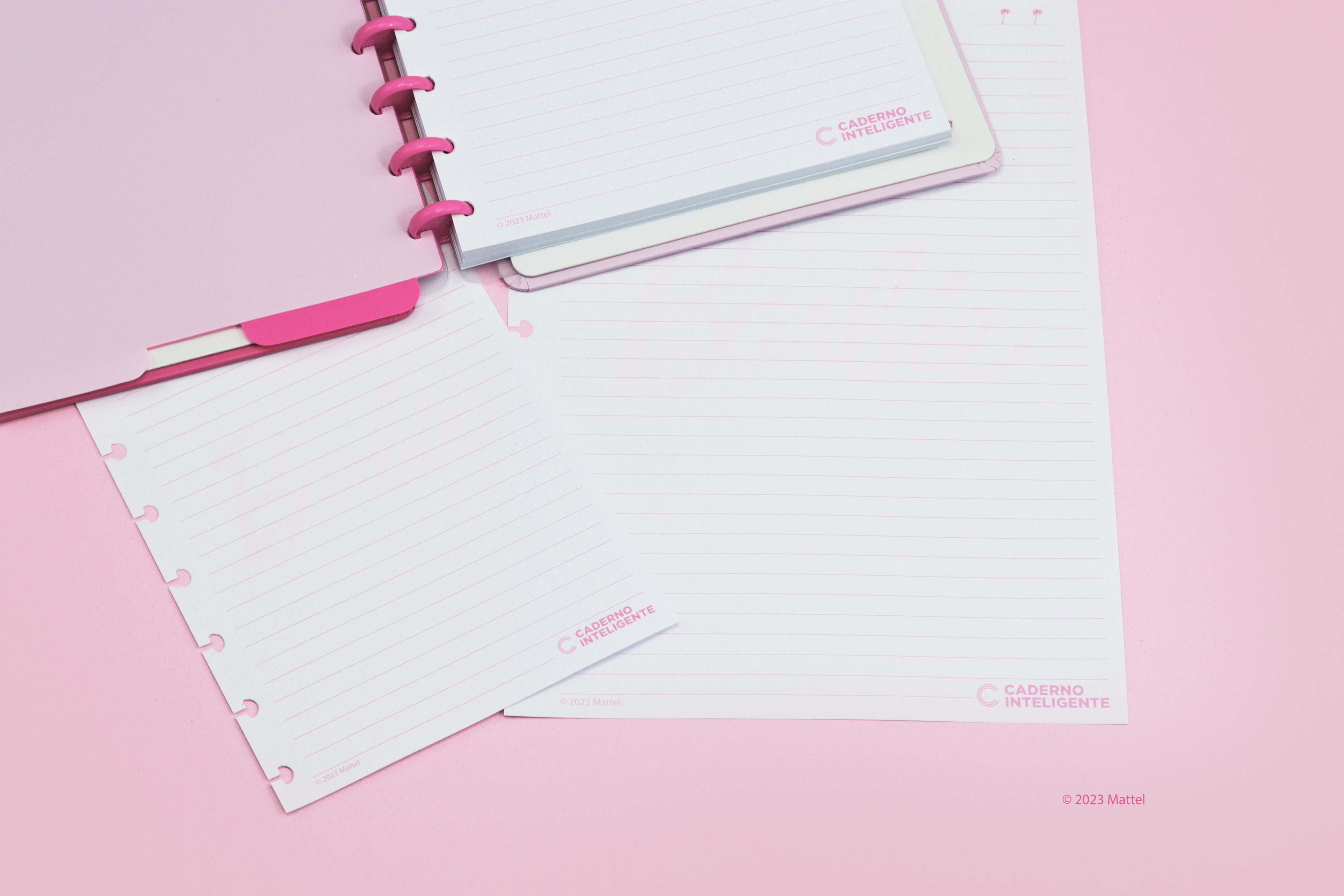 Já para personalizar o interior do seu Caderno Inteligente e transformá-lo num Pink World, é só adicionar as recargas Barbie Pink™️. Com um delicado tom de rosa, o logotipo oficial Barbie™ impresso nas folhas e detalhes únicos e originais, as suas anotações ficarão ainda mais bonitas.