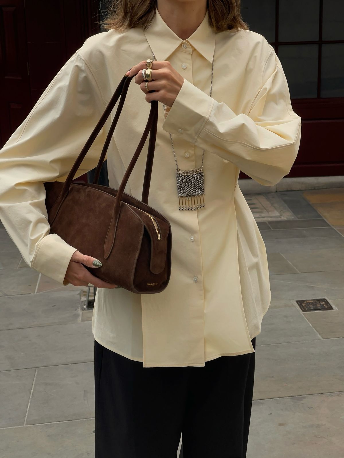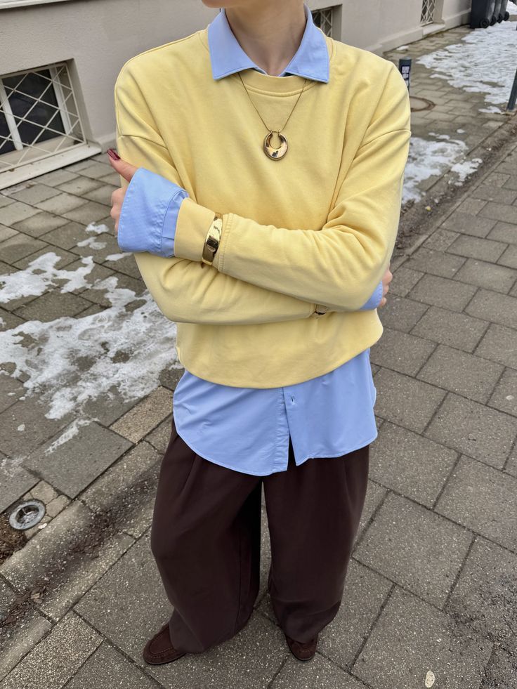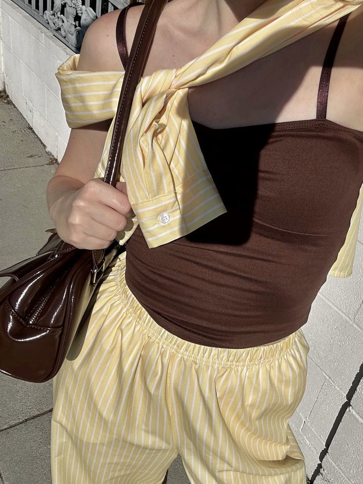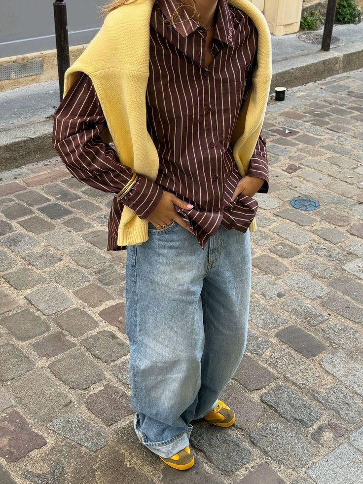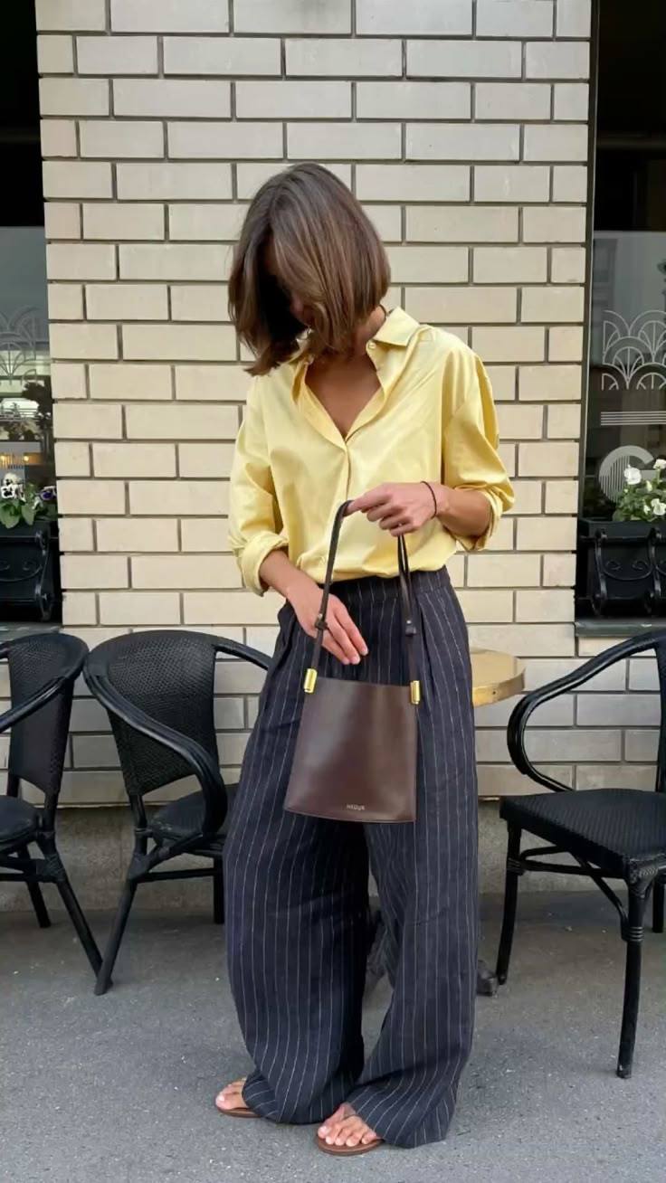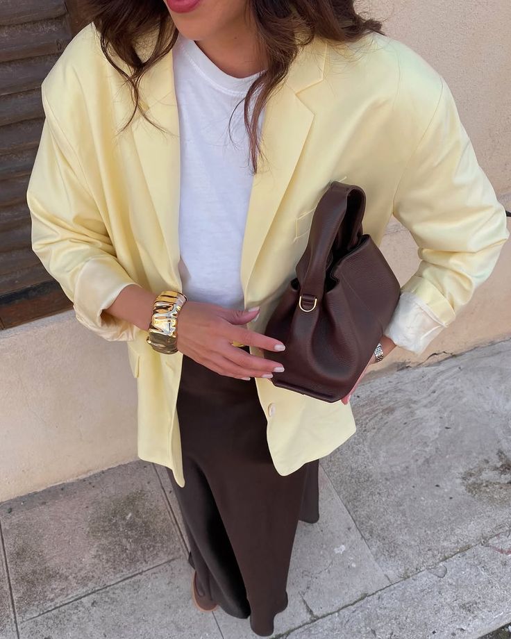 Talvez o castanho seja uma das combinações mais elegantes com o amarelo manteiga. É responsável por trazer contraste, mas também calor, criando um equilíbrio interessante entre o clássico e o moderno. Tons como chocolate ou caramelo ajudam a sofisticar o amarelo, tornando-o mais fácil de integrar em looks do dia a dia.