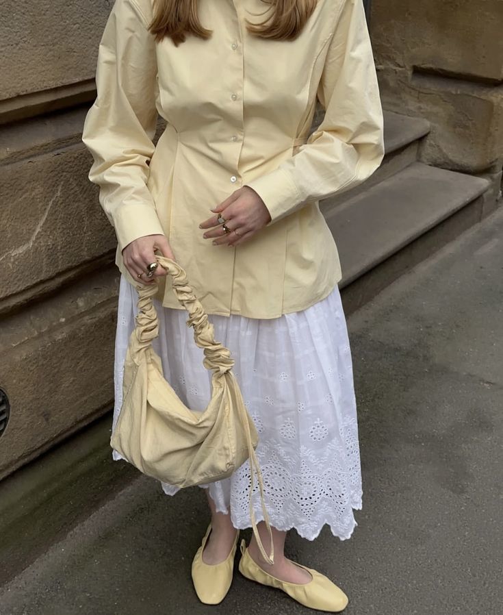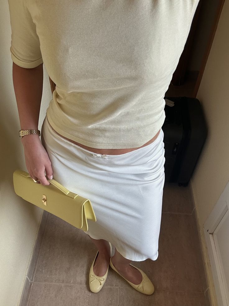 Clara, leve e intemporal. É assim que descrevemos a combinação do amarelo manteiga branco, que, na verdade, é a mais próxima da abordagem original da tendência, mas continua a funcionar. O branco reforça a luminosidade deste tom e cria looks frescos e elegantes. A diferença está nos detalhes: cortes, texturas (olá, renda) e acessórios fazem toda a diferença para evitar um resultado demasiado básico.