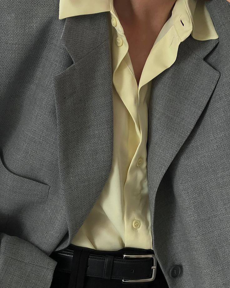 A combinação com cinzento é ideal para quem prefere uma estética mais discreta, minimalista e, sobretudo, eficaz – já para não falar de que é ótima para quem é adepto de looks mais discretos. O cinzento suaviza o impacto do amarelo manteiga e dá origem a um visual clean e contemporâneo. Arriscamo-nos a dizer que é especialmente interessante para ambientes profissionais.