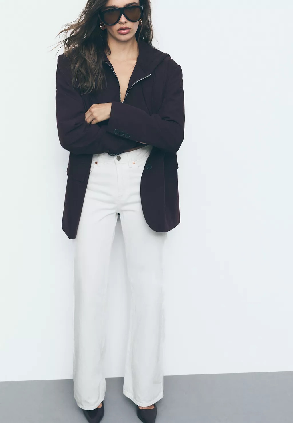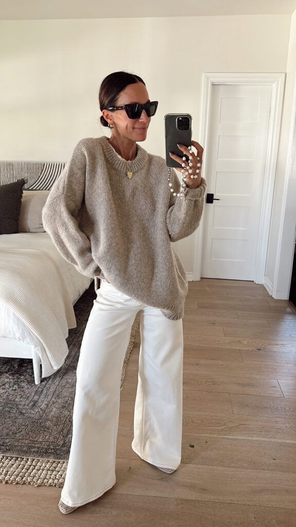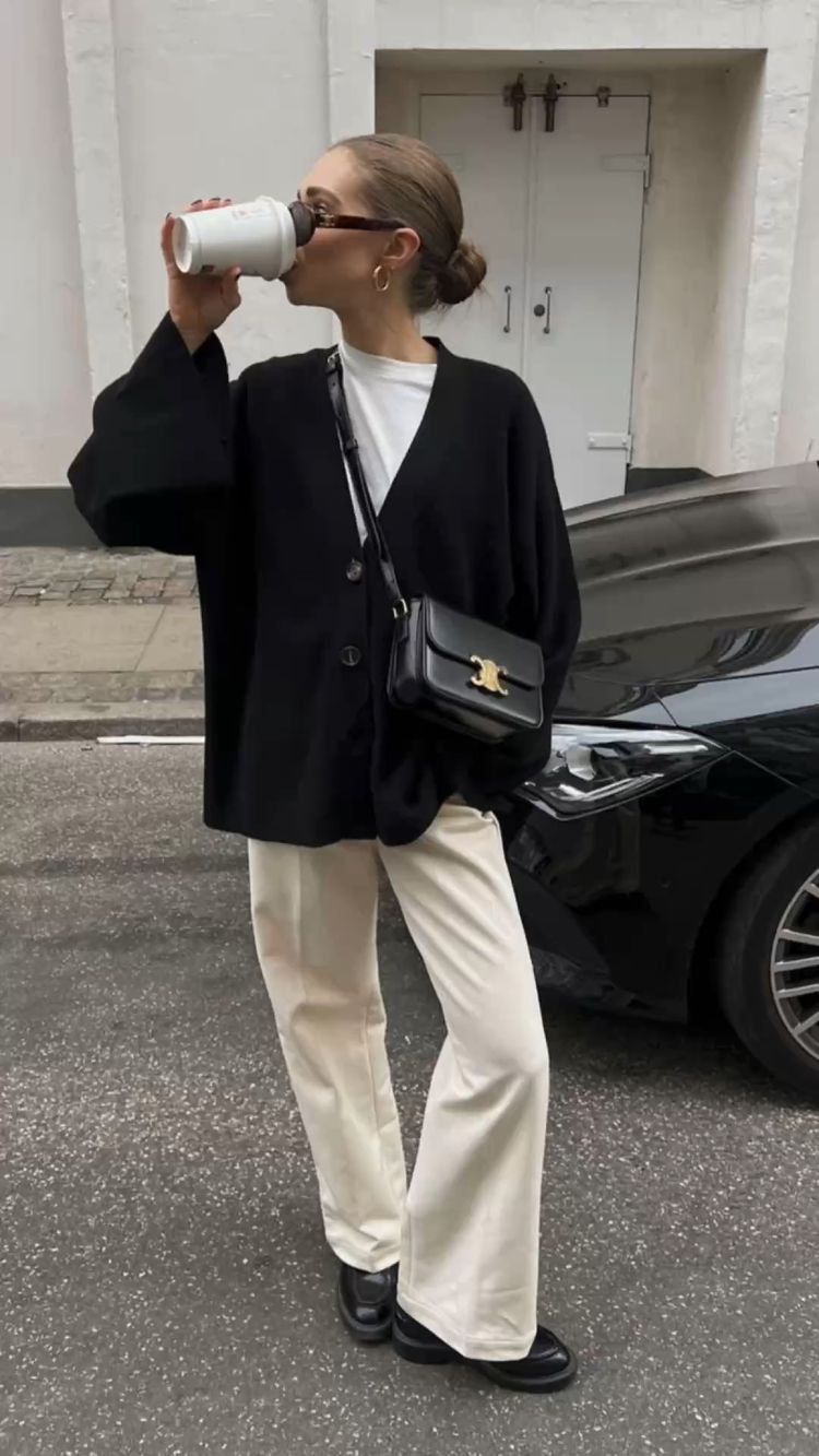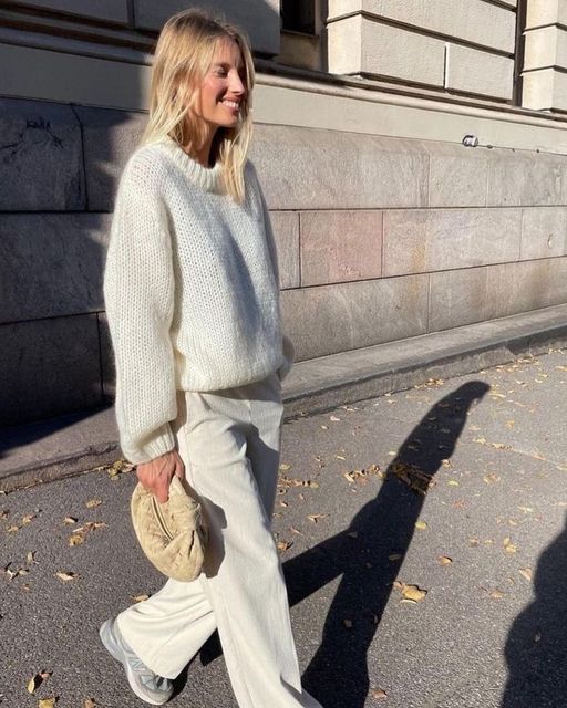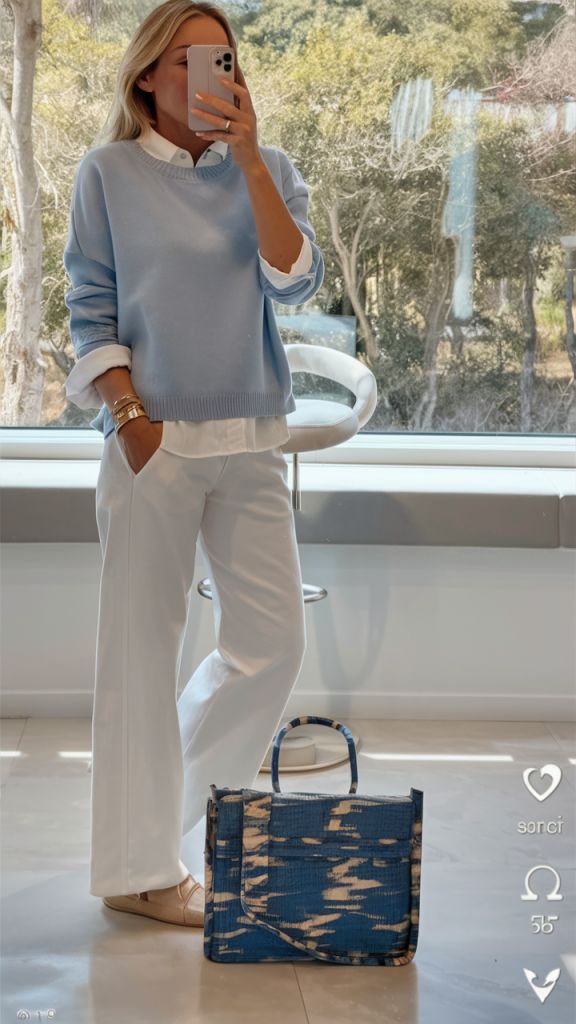 Quanto aos sapatos, há margem para experimentar. Mocassins, sabrinas, sandálias minimalistas ou até botas de meia-estação funcionam, desde que o conjunto mantenha coerência. A ideia não é parecer pronta para a praia, mas mostrar que o branco também vive (mais do que) bem fora dos meses quentes.