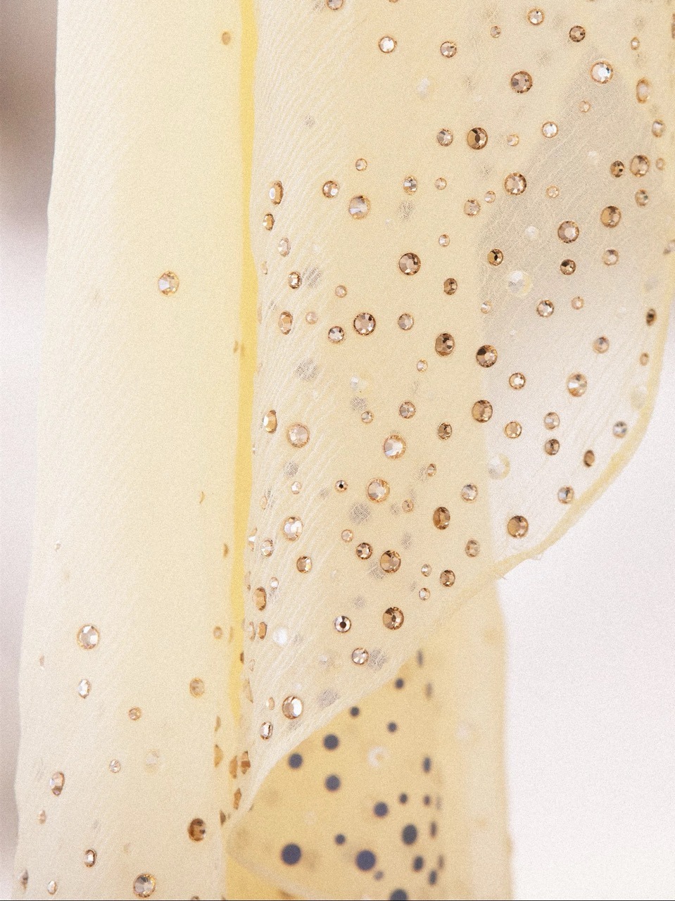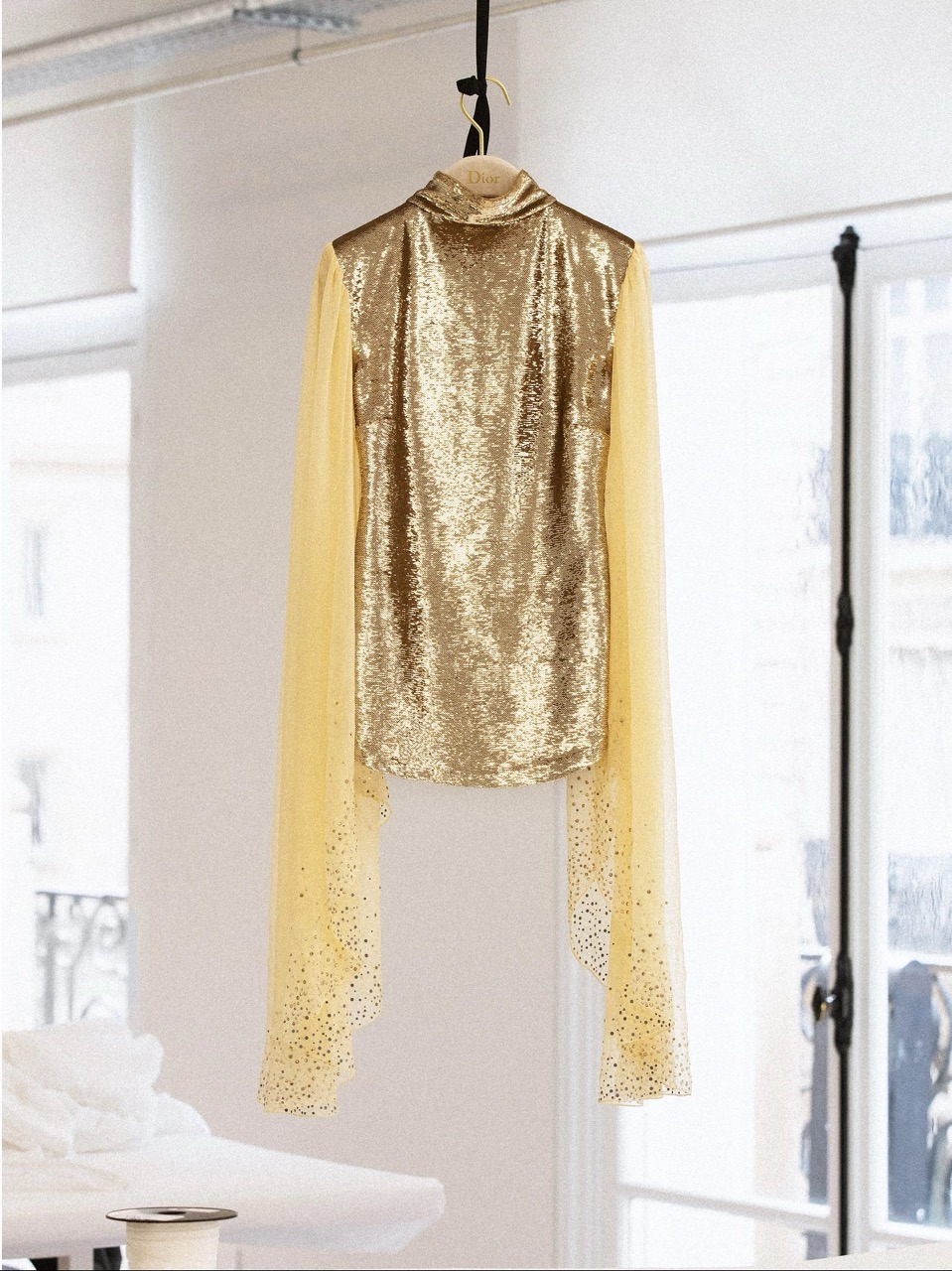 Seguiu-se um segundo look mais luminoso, que foi quase um “Espresso” de energia. Falamos de um mini vestido dourado, também bordado com lantejoulas, combinado com mangas em chiffon cravejadas de strass, com um brilho performativo, que já é a assinatura da cantora. Percebemos o fascínio por tudo o que cintile, já que, em palco, as luzes ajudam a amplificar a presença de peças que reluzam.